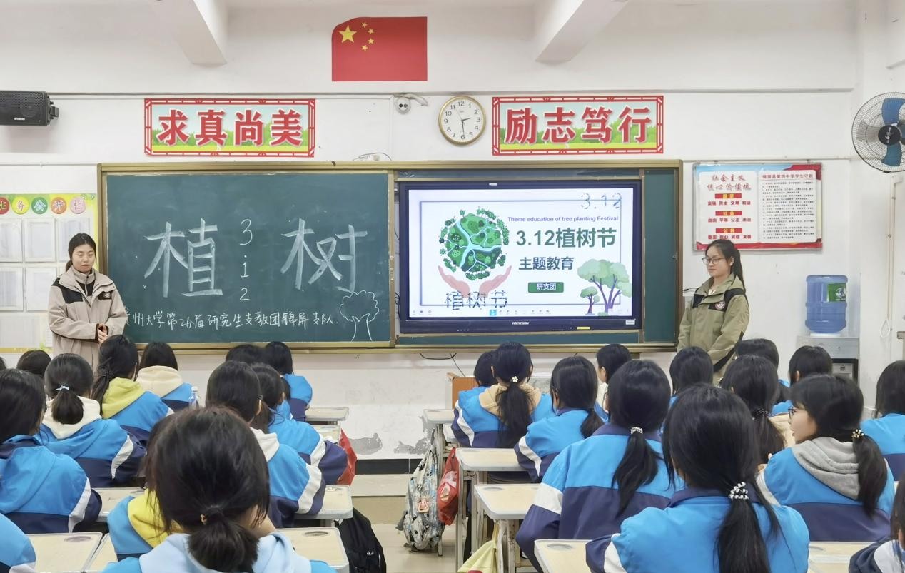 研支团成员充分发挥教育专业优势,精心设计“植树节主题课堂”。通过多媒体课件、互动问答等形式,向学生讲解植树节的由来、生态保护的重要性,并结合劳动教育理念,阐释“植树造林”与“劳动创造价值”的深层关联。
